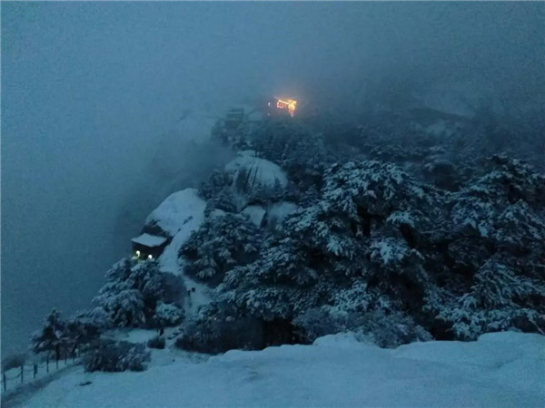 一直往上走,天色漸漸暗下來。和路上遇到的兩位山友告別后,我一個(gè)人繼續(xù)走,路面都是積雪,有的還結(jié)冰了,只好綁上冰爪,打開手電,偶爾抬頭看看被白雪浸染的山林。忽然,前面山頂上一片燈火輝煌,不知道那是不是天上的宮闕?