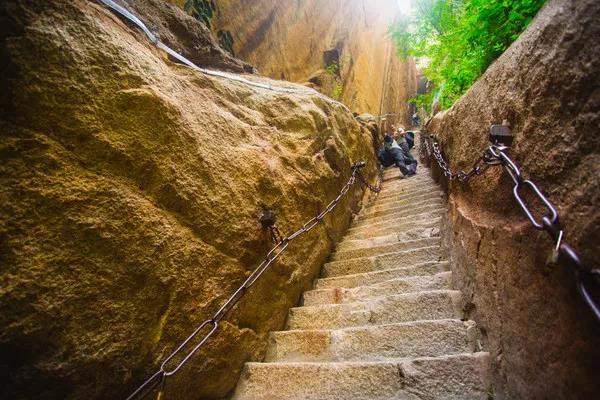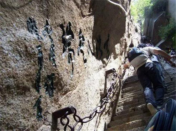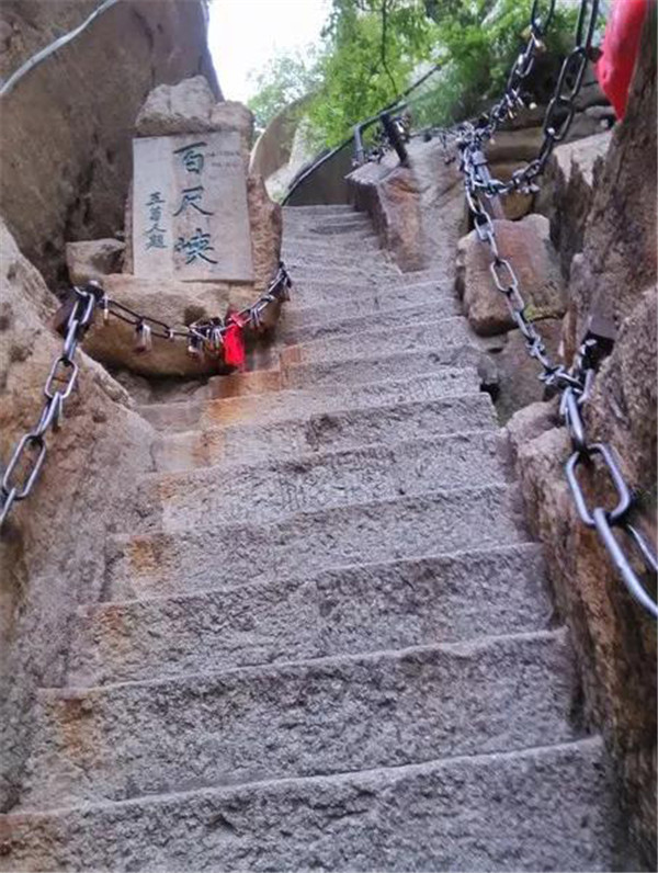 千尺幢位于回心石之上,是華山第一險境。山幢壁直立,其間僅容二人上下穿行。兩邊鐵鏈垂直下垂,坡度為70°。從上到下共有370多個臺階,皆不滿足寬。