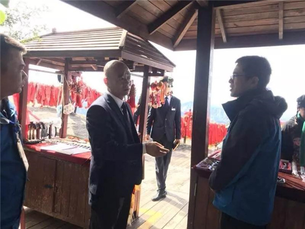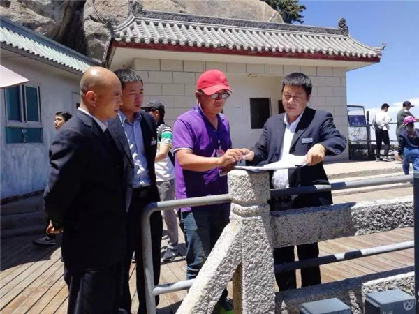 其實,雷科峰平時對大家要求挺嚴的,職工背后議論說雷科峰有一種軍人作風,凌厲、硬氣,大家跟上他干事活多還辛苦。印象最深的是那一次美化南天門“三間房一頁瓦”附近的臺地??油莶黄降呐_地上原來蒙著一堆土,晴天一層灰,雨天滿地泥,冬天雪泥一凍一消,平臺就成了沼澤,不說過來過去行走不便,看起來也讓人不舒服,游客常常一不小心就濺得滿身的泥水,很掃興,雷科峰下決心美化平臺。美化平臺所用的沙子、石子、水泥要到二三里路遠的溝底去背。從山頂?shù)綔系?,一路上全是立坡陡崖,雷科峰領著十幾名職工利用六天的工余時間,硬是把近二十噸的沙石背了上來。背料過程中,有的職工肩膀磨破了,有的雙腿像篩糠一樣抖個不停,許多職工中途不敢蹴下來休息,怕一蹴下就再也站不起來了,歇息時把沙袋子擱在路邊的石坎上,人站著緩口氣……一個個汗流浹背,氣喘吁吁。