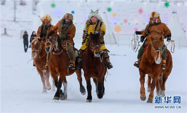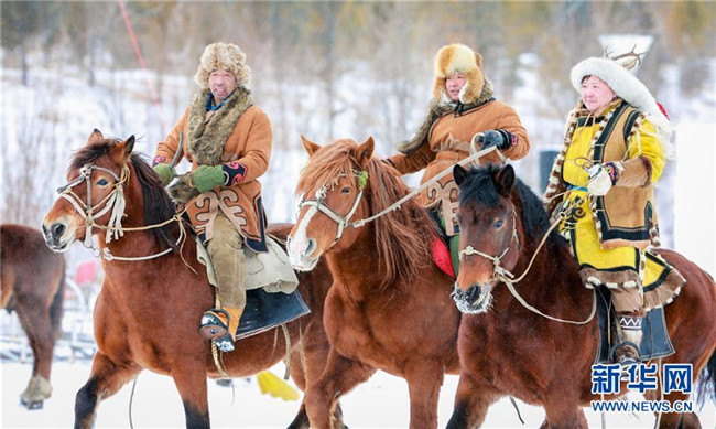 12月26日,馬隊(duì)在“伊薩仁”開幕式上表演。 當(dāng)日,內(nèi)蒙古呼倫貝爾市第五屆鄂倫春冰雪“伊薩仁”在鄂倫春自治旗開幕。“伊薩仁”是鄂倫春語“集會”“聚會”的意思。此次“伊薩仁”期間,將舉行鄂倫春徒步林海穿越、汽車越野拉力賽、冰雪觀賞、雪上沖浪等活動,為游客帶來不一樣的冰雪體驗(yàn)。 新華社發(fā)(丁根厚 攝)