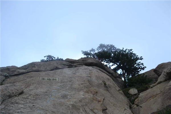 我和孩子抓緊時間往東峰趕,經(jīng)紫氣臺、二仙坎,攀爬一道石梁前往東峰山門。此時飄來小雨點,我們顧不得腳下濕滑加快了腳步。經(jīng)鷂子翻身,孩子想要征服天險的念頭依然強烈,一心想翻鷂子翻身,后因人多需排隊等候而暫時放棄。東峰又叫朝陽峰,朝陽臺是觀日出的勝地。我倆左轉攀爬朝陽臺,雨漸漸大起來。至臺頂,方舉目四顧,黃豆大小的密集雨點劈頭蓋臉砸下。朝陽臺上沒有看到太陽,卻遭遇暴雨,我們狼狽撤離朝陽臺。
