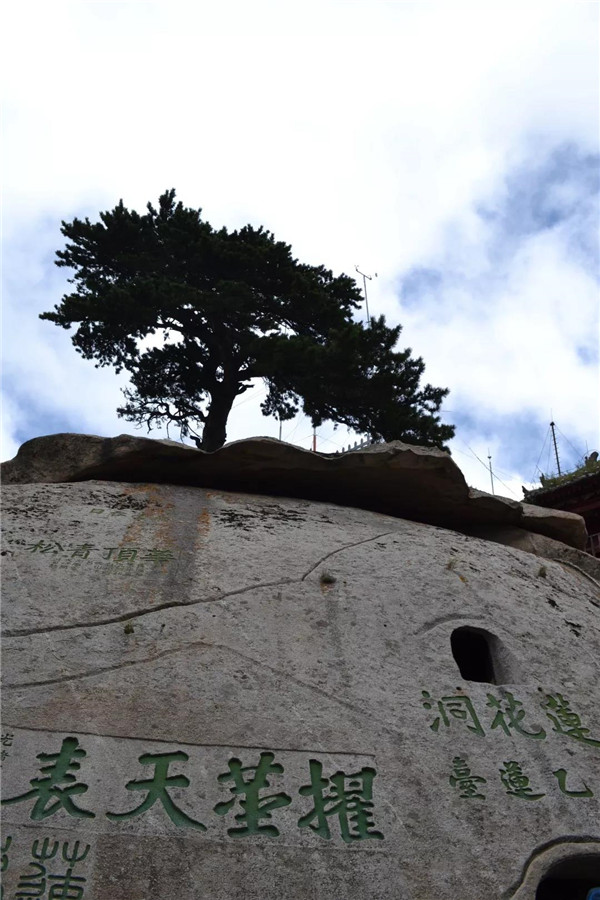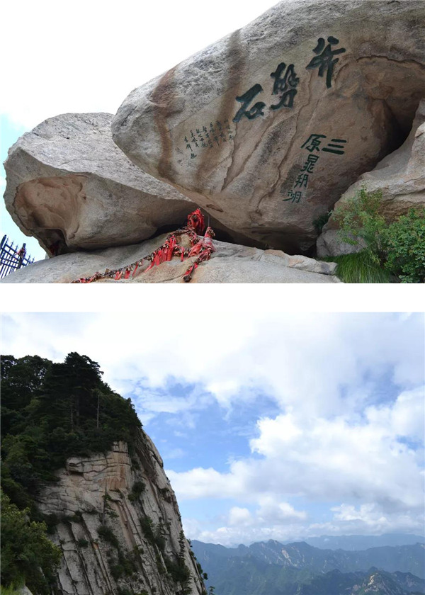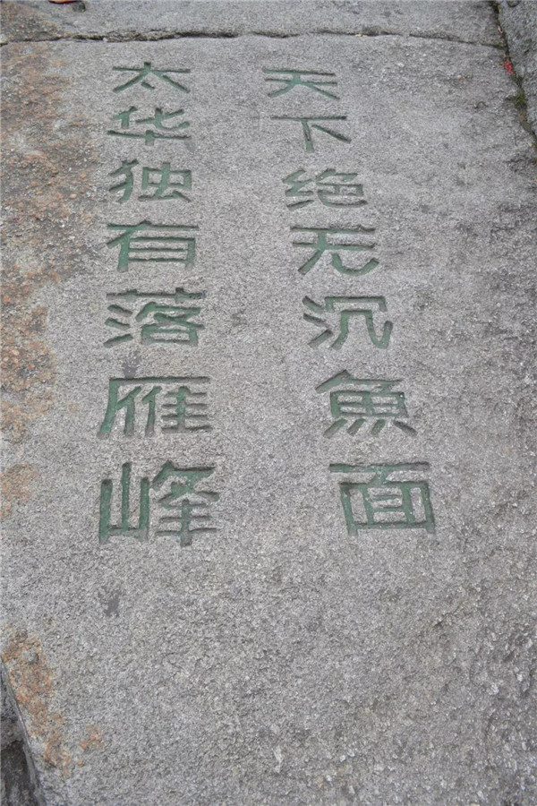 在南峰頂,孩子看到“天下絕無沉魚面,太華獨有落雁峰”的題刻,打趣我:“媽媽,你叫鴻雁,這里又叫落雁峰,真是和你有緣呢!快來這塊大石頭上落落腳,歇一歇!”“好啊!咱倆都爬累了,都歇一歇!”我為孩子的體貼欣慰!
