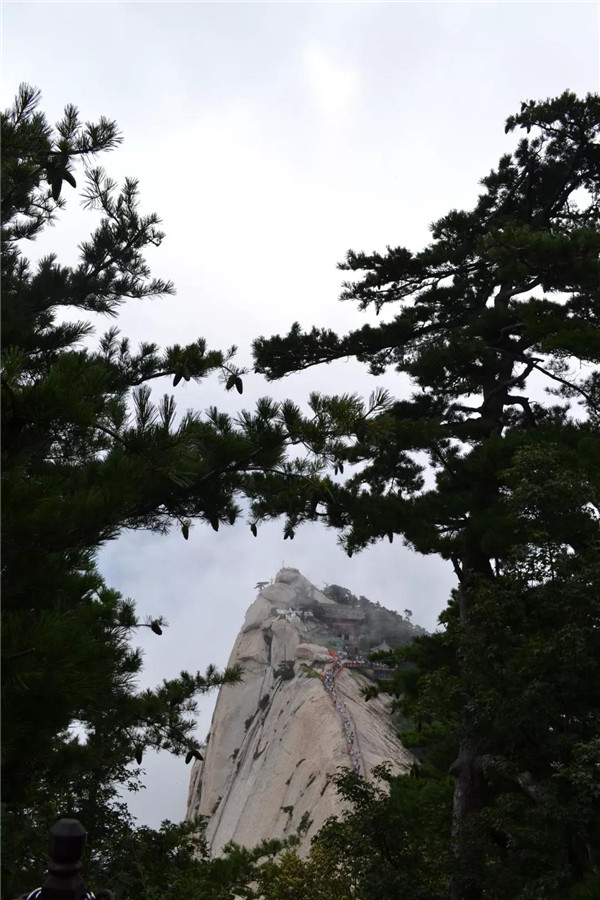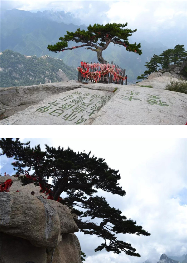 經(jīng)煉丹爐、孝子峰,云霧悄悄退隱,我們向南峰頂挺進。南峰蒼翠秀麗,沿途的華山松千姿百態(tài),引人注目。華山迎客松生長于懸崖峭壁的石縫中,向懸崖一側伸出虬勁的枝干,就像好客的秦人伸出有力的大手歡迎遠道而來的客人。虬枝龍形的枝干上,是綠意盎然的松針,根根好像要刺破天穹。華山迎客松在藍天白云的映襯下,仿如碧玉雕琢而成,綠的耀眼,秀挺卓然!