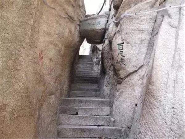 “千尺幢”在華山峪古道“回心石”上,是經(jīng)華山峪登主峰的必經(jīng)之道。這里原為一崖間裂隙,直立70度,后來人們沿隙鑿?fù)爻陕罚惺A370級,階寬僅容半足,游人登臨時,仰視一線天,俯視若臨深井。