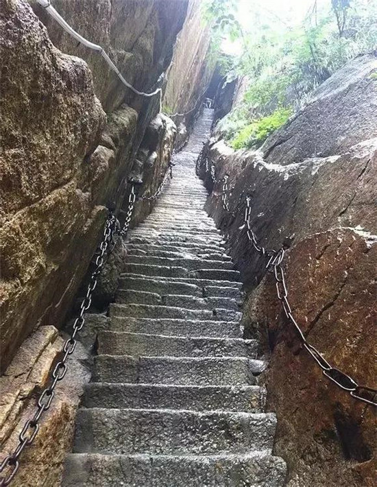 這是一個溫暖的美麗秋天,華山壯觀的峭壁在陽光下閃閃發(fā)亮,稀有樹木炫耀著多彩的秋葉,遠方跳躍的瀑布吸引著游客的眼球,奇形怪狀的點點白云在腳下緩緩流動。我和我的朋友開始了一場艱苦的旅行,一起攀登6,600多級鑿在巖石上的臺階,目標是海拔2154.9米南峰之巔祭祀華山神的道觀?! ?