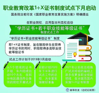 “職教20條”提出,從2019年開始,在職業(yè)院校、應(yīng)用型本科高校啟動(dòng)“學(xué)歷證書+若干職業(yè)技能等級證書”制度試點(diǎn)(以下稱1+X證書制度試點(diǎn))工作。試點(diǎn)工作要進(jìn)一步發(fā)揮好學(xué)歷證書作用,夯實(shí)學(xué)生可持續(xù)發(fā)展基礎(chǔ),鼓勵(lì)職業(yè)院校學(xué)生在獲得學(xué)歷證書的同時(shí),積極取得多類職業(yè)技能等級證書,提高就業(yè)創(chuàng)業(yè)本領(lǐng),緩解結(jié)構(gòu)性就業(yè)矛盾。