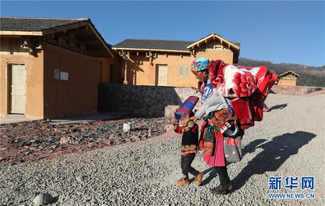 在昭覺(jué)縣三河村易地扶貧安置點(diǎn),馬海阿依帶著女兒搬進(jìn)新居(2月11日攝)。2月11日,三河村首批29戶、168人告別居住多年的土坯房,搬入易地扶貧安置點(diǎn)的新家。新華社記者 江宏景 攝