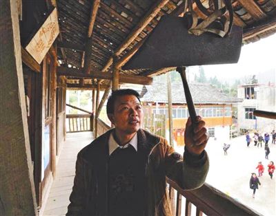 代課教師潘平忠在孖堯教學(xué)點(diǎn)教學(xué)樓二樓敲簡(jiǎn)易制作的上課鈴。