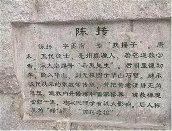 陳摶:陳摶(872年—989年),字“圖南”,號(hào)“扶搖子”、“希夷先生”(“希”指視而不見,“夷”指聽而不聞),常被視為神仙,尊稱為陳摶老祖、希夷祖師等。主張以睡眠,休養(yǎng)生息,時(shí)常一眠數(shù)日,人稱睡仙。相傳紫微斗數(shù)及無極圖說皆為陳摶之創(chuàng)作。五代末,宋朝初期亳州真源(今河南鹿邑)人,著名華山派道士。