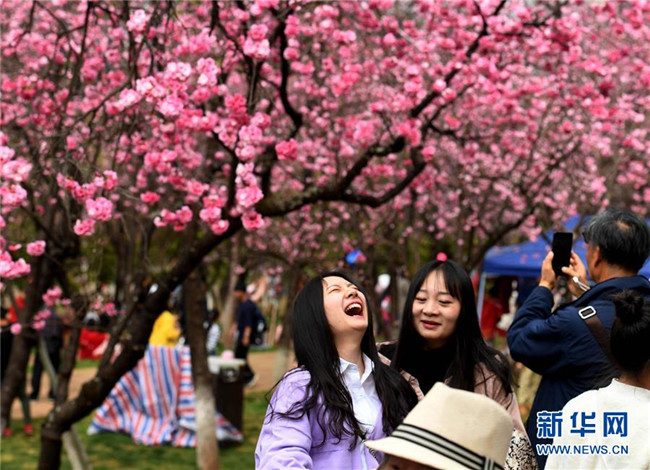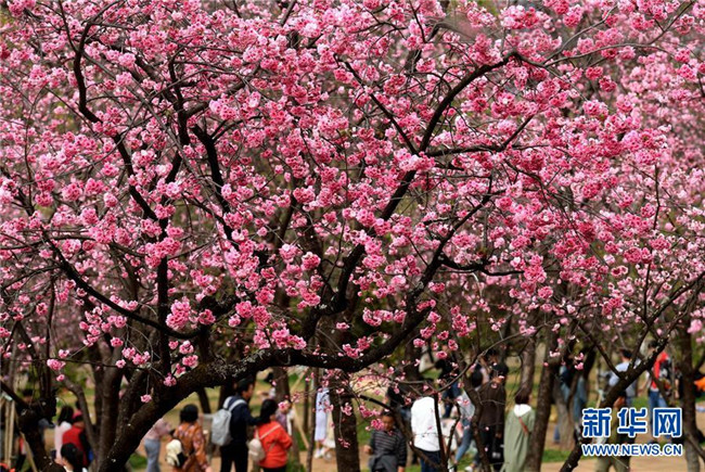 游人在昆明圓通山公園觀賞盛開的櫻花(3月16日攝)。新華社記者 秦晴 攝
