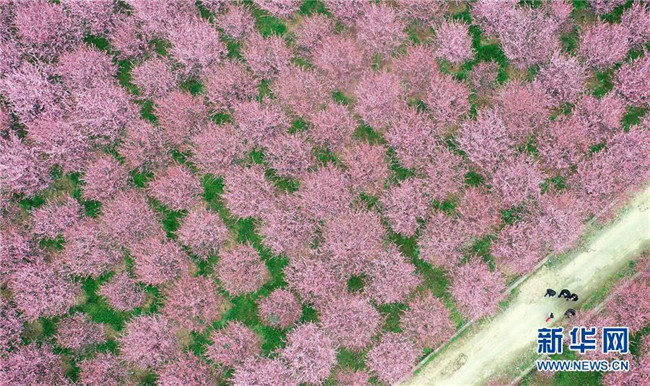 3月19日,游人在陜西勉縣新街子鎮(zhèn)觀賞美人梅(無人機(jī)拍攝)。近日,陜西省漢中市勉縣新街子鎮(zhèn)數(shù)十畝美人梅開放,吸引游人前來踏春賞花。 新華社記者 劉瀟 攝