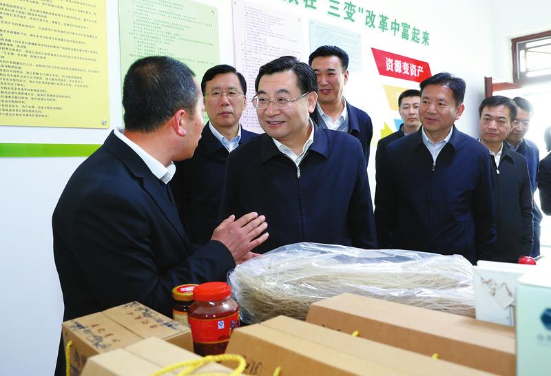 三月二十七日,省委書(shū)記胡和平來(lái)到白水縣杜康鎮(zhèn)和家卓村,聽(tīng)取“黨支部+村集體經(jīng)濟(jì)+園區(qū)+貧困戶(hù)”扶貧介紹,詳細(xì)了解設(shè)施農(nóng)業(yè)發(fā)展、田園綜合體運(yùn)行、群眾增收等情況。 記者 宋紅梅攝