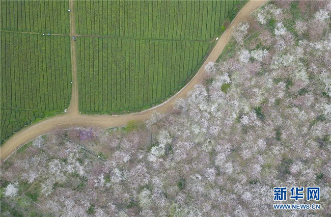 這是3月27日拍攝的貴州省貴安新區(qū)櫻花觀光園的櫻花和旁邊的茶園(無人機拍攝)。新華社記者 陳曄華 攝