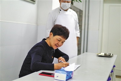安樂幼兒園園長張萍試吃幼兒午餐并進行記錄評價。新京報記者 馮琪 攝