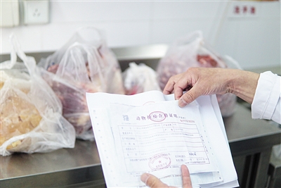 安樂幼兒園食堂管理員查驗動物檢疫合格證明等。新京報記者 馮琪 攝