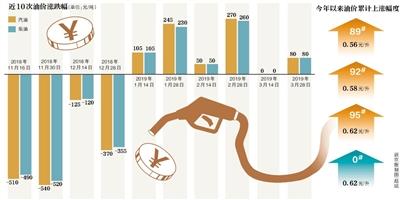 此前的2月28日,國內(nèi)汽油、柴油價格(標準品,下同)分別上調(diào)270元/噸、260元/噸,不僅是我國成品油2019年來的“四連漲”,更是創(chuàng)下今年來最大上漲幅度。3月14日,汽油、柴油價格終于停下上漲的步伐——國內(nèi)成品油價格不作調(diào)整。數(shù)據(jù)顯示,上一次油價擱淺為去年3月14日,成為當(dāng)年唯一的一次擱淺。