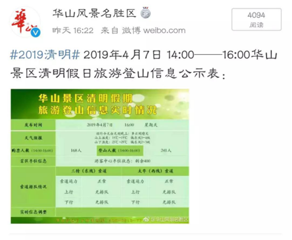 景區(qū)節(jié)日期間通過(guò)電子大屏、官方微博、微信、短信平臺(tái)向游客和各單位提供實(shí)時(shí)登山排隊(duì)人數(shù)、車位、天氣等信息。(小長(zhǎng)假期間新浪微博共計(jì)發(fā)送微博48條,網(wǎng)友留言及回復(fù)361條,閱讀量共計(jì)421446余次;微信公眾平臺(tái)共計(jì)發(fā)送18篇軟文報(bào)道,分享及轉(zhuǎn)發(fā)量共計(jì)1098次,閱讀量共計(jì)10272次;短信平臺(tái)共計(jì)發(fā)送2394條短信,及時(shí)匯報(bào)各項(xiàng)旅游信息)。