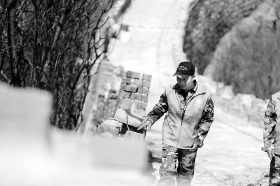 上午10時(shí),記者跟隨參與長(zhǎng)城修繕的工作人員向箭扣長(zhǎng)城進(jìn)發(fā)。經(jīng)過近1個(gè)小時(shí)的攀登,記者們都已經(jīng)疲憊不堪,工作人員卻依然步履輕松,“我們每天都要上下爬一趟,已經(jīng)習(xí)慣了。”一位工作人員說。終于抵達(dá)151敵樓,蜿蜒于山脊線上的箭扣長(zhǎng)城展現(xiàn)出了它的雄姿。在151的南側(cè),工人師傅正在對(duì)一段城墻進(jìn)行修繕,他們搬起一塊塊幾十斤重的舊城磚,小心翼翼地把它鋪到城墻面上,再用橡膠錘敲打緊實(shí)。