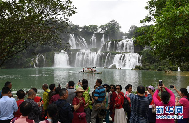 近日,隨著降雨增多,位于中越邊境的廣西大新縣德天瀑布水量增大,吸引大批游客前來觀光游覽。新華社記者 陸波岸 攝