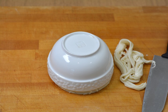8.將幾張搟好的餅皮摞一起,取一個碗,碗口扣在餅上,用刀丸沿著碗邊將多余的餅劃掉;