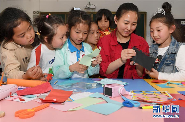 陜西省延安市楊家?guī)X福州希望小學(xué)美術(shù)社團(tuán)的學(xué)生在進(jìn)行剪紙(4月24日攝)。