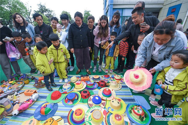 4月28日,家長(zhǎng)帶著孩子們?cè)谔暨x手工作品。 新華社記者 徐昱 攝