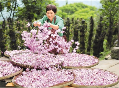 近日,貴州省赤水市的金釵石斛花陸續(xù)進入盛花期。據(jù)了解,金釵石斛是一種名貴中藥材,有“仙草”之稱。近年來,赤水市多個鄉(xiāng)鎮(zhèn)積極推進農(nóng)業(yè)與鄉(xiāng)村旅游等產(chǎn)業(yè)融合,采取“合作社+支部+農(nóng)戶”模式,鼓勵農(nóng)民種植金釵石斛,助力脫貧攻堅和鄉(xiāng)村振興。圖為一名當(dāng)?shù)剞r(nóng)婦在晾曬剛采摘的金釵石斛鮮花。王長育攝(新華社發(fā))