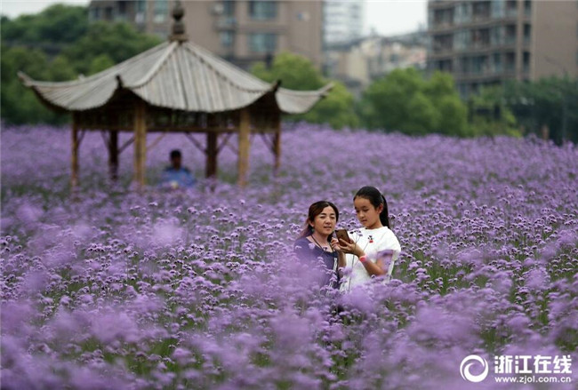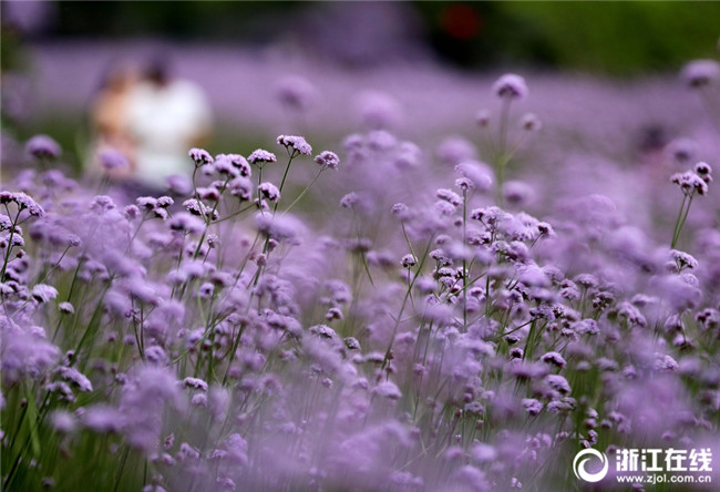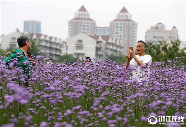 5月12日,在杭州城北體育公園邊,柳葉馬鞭草進入盛花期,開成了一片紫色花海,吸引著許多市民在花海里愜意徜徉。(浙江在線記者 林云龍 攝)