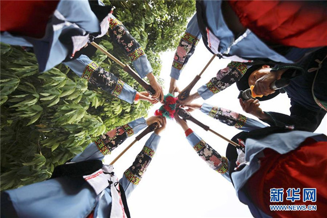 5月14日,在畢節(jié)市黔西縣協(xié)和鎮(zhèn)立新村立新小學(xué),孩子們?cè)诶蠋煹闹笇?dǎo)下學(xué)習(xí)蘆笙。新華社發(fā)(周訓(xùn)超 攝)