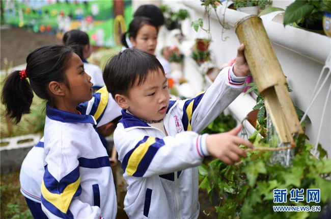 5月14日,在銅仁市松桃苗族自治縣盤(pán)石鎮(zhèn)響水洞村的山村幼兒園,孩子們?cè)跒樵耘嗟闹参餄菜?。新華社發(fā)(龍?jiān)?攝)