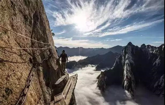 華山長空棧道位于華山南峰東側(cè)山腰。相傳,是華山派第一代宗師元代高道賀志真為遠(yuǎn)離塵世靜修成仙,在萬仞絕壁上鑲嵌石釘搭木椽而筑。棧道上下皆是懸崖絕壁,鐵索橫懸,由條石搭成尺許路面,下由石柱固定,游人至此,面壁貼腹屏氣挪歩,是“全球十大恐怖的懸崖步道”之一。