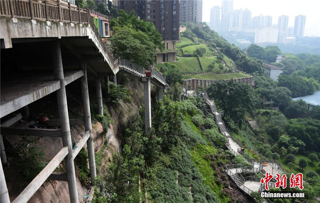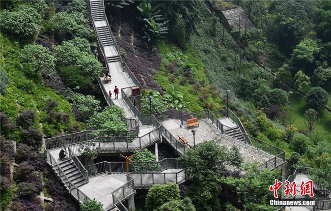 重慶一小區(qū)與半坡棧道相連,吸引市民前往體驗(yàn)。中新網(wǎng) 周毅 攝