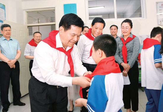 李紀恒來到一年級二班,“愛祖國、擔大任,爭做新時代好隊員”主題隊日活動正在舉行,一名少先隊員走上前來,為他戴上鮮艷的紅領巾。李紀恒說,看到小朋友們快樂活潑、朝氣蓬勃,我很高興,“六一”國際兒童節(jié)快到了,我提前祝大家和全區(qū)的小朋友們節(jié)日快樂、學習進步、健康成長。