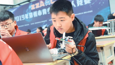 3月31日,2019年鄭州市青少年機(jī)器人競(jìng)賽首次將線上創(chuàng)意編程比賽納入競(jìng)賽中。圖為選手在比賽前編程。張 濤攝(人民視覺(jué))