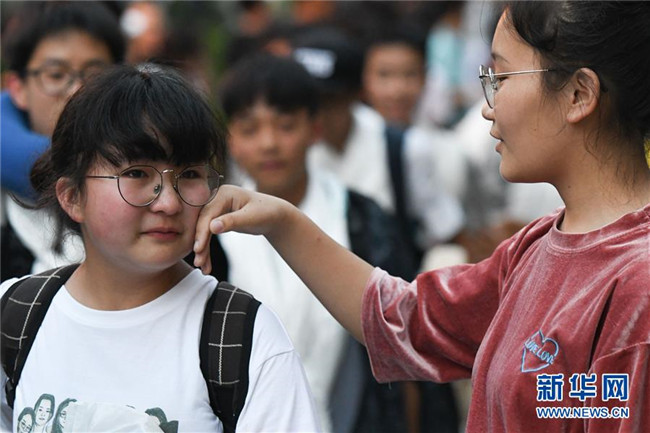 6月9日,合肥市第三十五中學西藏班的初三畢業(yè)生(右)與老師告別時落淚。