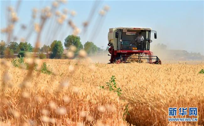 6月10日,在河北石家莊市藁城區(qū),農(nóng)民駕駛農(nóng)機(jī)收獲小麥。 新華社發(fā)(張曉峰 攝)