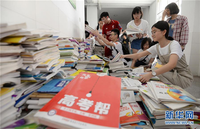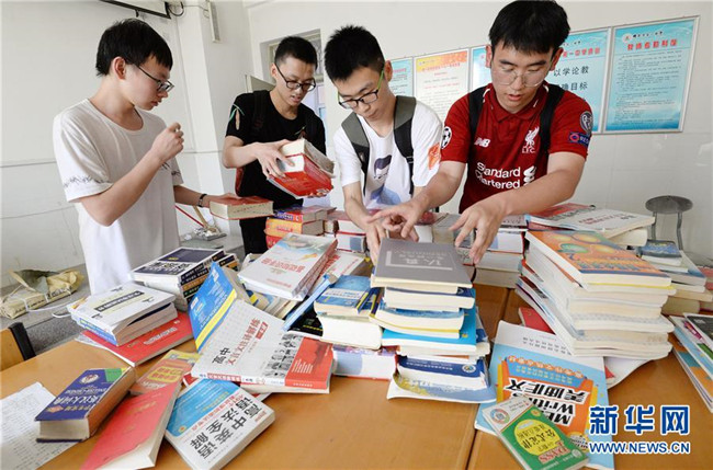 6月9日,在河北省邯鄲市第一中學(xué),高三畢業(yè)生整理同學(xué)們捐贈的書籍。