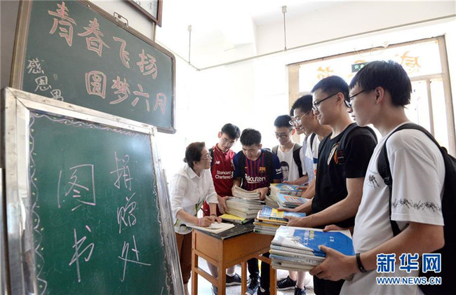 6月9日,在河北省邯鄲市第一中學(xué),高三畢業(yè)生在捐贈書籍。