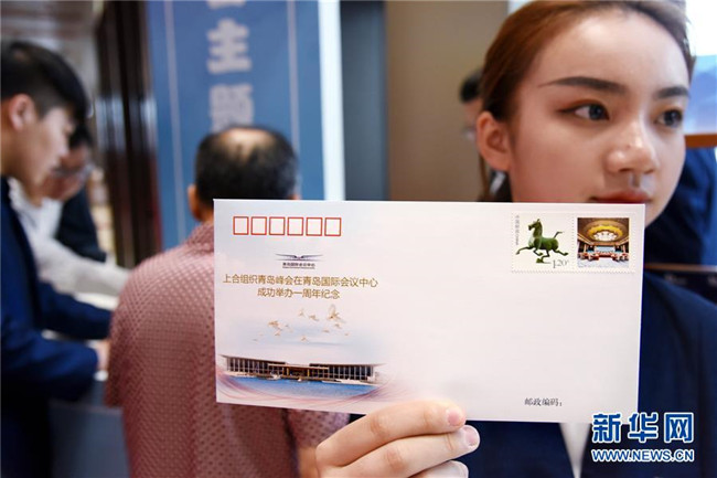 6月9日,工作人員展示上合青島峰會一周年紀念封。新華社記者 李紫恒 攝