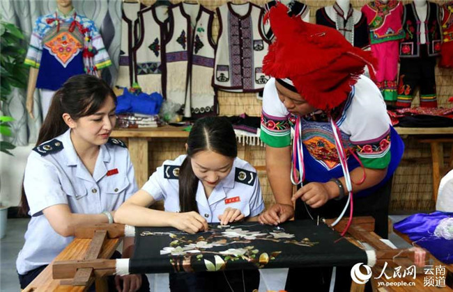 6月18日,恰逢硯山縣稅務(wù)局上門(mén)服務(wù),王陸芬教稅務(wù)人員刺繡。攝影:陸安恒
