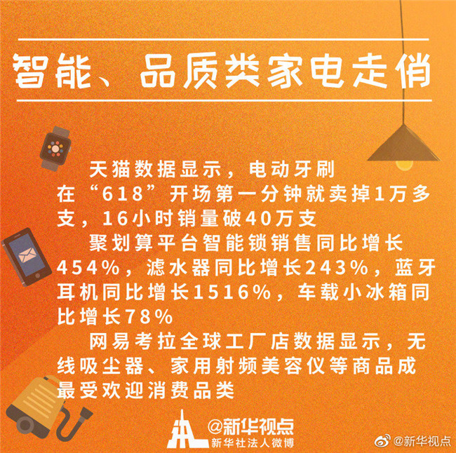 除了滿足“剛需”的大家電,提升生活品質(zhì)的小家電也十分走俏。天貓數(shù)據(jù)顯示,電動牙刷在“618”開場第一分鐘就賣掉1萬多支,16小時銷量破40萬支。聚劃算平臺智能鎖銷售額同比增長454%,濾水器同比增長243%,藍牙耳機同比增長1516%,車載小冰箱同比增長78%。在網(wǎng)易考拉全球工廠店,無線吸塵器、家用射頻美容儀等商品成最受歡迎消費品類。