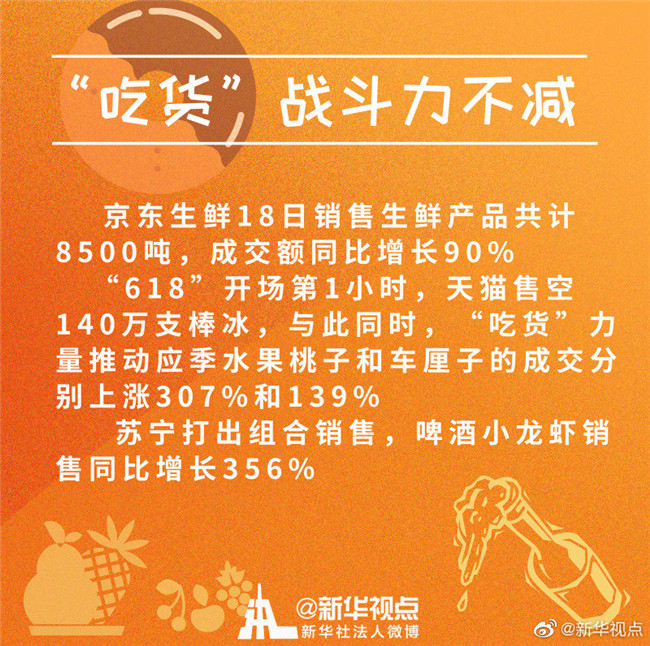 京東生鮮18日銷售生鮮產(chǎn)品共計8500噸,成交額同比增長90%。6月16日第1小時,天貓售空140萬支棒冰,“吃貨”力量推動應季水果桃子和車厘子成交額分別上漲307%和139%。蘇寧打出組合銷售,啤酒小龍蝦銷售同比增長356%……