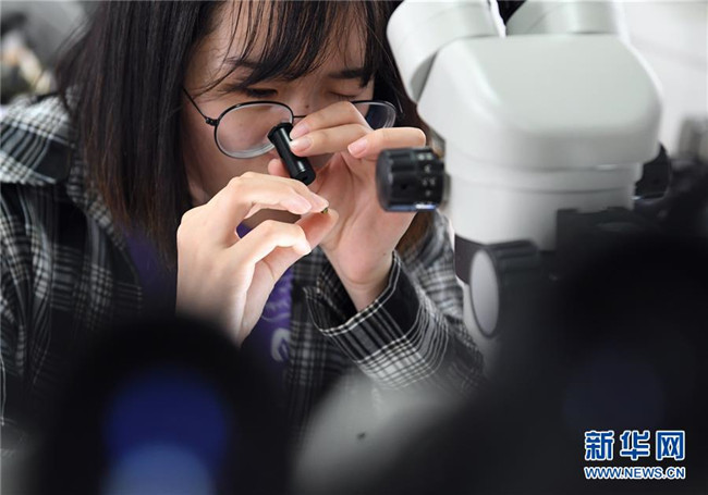 在長(zhǎng)安大學(xué)珠寶鑒定實(shí)驗(yàn)室,地質(zhì)學(xué)專(zhuān)業(yè)寶玉石學(xué)與珠寶鑒定方向的學(xué)生在觀測(cè)樣本(5月28日攝)。新華社記者張博文攝