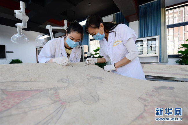 在洛陽(yáng)市文物考古研究院,西北大學(xué)文物保護(hù)技術(shù)專(zhuān)業(yè)學(xué)生田丹玉(左)和壁畫(huà)修復(fù)師田玉娥清理一件唐代壁畫(huà)(5月22日攝)。新華社記者李一博攝