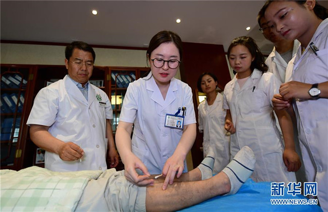 在陜西中醫(yī)藥大學(xué)附屬醫(yī)院名醫(yī)館,針灸推拿學(xué)專(zhuān)業(yè)學(xué)生王娟(左二)在教授雷正權(quán)的指導(dǎo)下練習(xí)針刺(6月4日攝)。新華社記者李一博攝