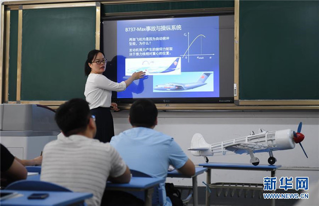 在西北工業(yè)大學(xué)航空學(xué)院,副教授劉艷在飛行器設(shè)計(jì)與工程專(zhuān)業(yè)的飛行動(dòng)力學(xué)課程上分析波音客機(jī)墜毀原因(6月14日攝)。新華社記者李一博攝