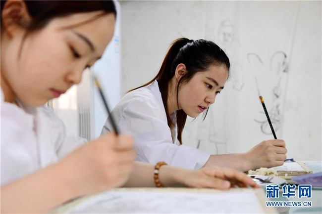 在洛陽(yáng)市文物考古研究院,西北大學(xué)文物保護(hù)技術(shù)專(zhuān)業(yè)學(xué)生田丹玉(右)和梁楚昕在臨摹壁畫(huà)(5月22日攝)。新華社記者李一博攝