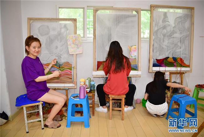 西安美術(shù)學(xué)院特殊教育藝術(shù)學(xué)院工藝美術(shù)專(zhuān)業(yè)學(xué)生在進(jìn)行纖維藝術(shù)創(chuàng)作(5月23日攝)。新華社記者邵瑞攝