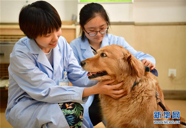 西北農(nóng)林科技大學(xué)動(dòng)物醫(yī)學(xué)專(zhuān)業(yè)學(xué)生在學(xué)校的動(dòng)物醫(yī)院內(nèi)安撫一只寵物狗(5月25日攝)。新華社記者邵瑞攝