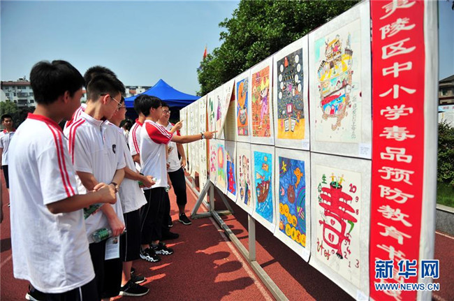 6月26日,湖北省宜昌市夷陵區(qū)東湖高中的學(xué)生觀看毒品預(yù)防教育書畫展。 新華社發(fā)(張國榮攝)